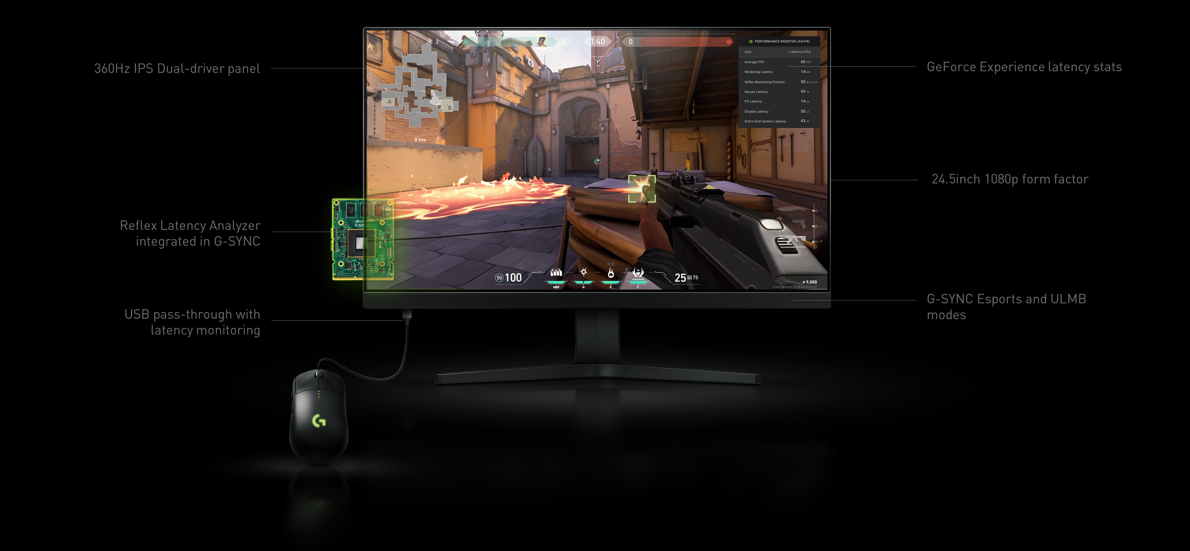NVIDIA Reflex Latency Analyzer: Ein revolutionäres Tool zur Messung der Systemlatenz, das in neuen die G-Sync-E-Sports-Displays mit 360 Hz von Acer, Asus, MSI und Dell integriert ist und von den besten E-Sports-Peripheriegeräten von Asus, SteelSeries, Logitech und Razer unterstützt wird.
