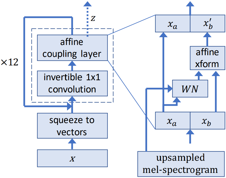 During training, the model learns to transform the dataset distribution into spherical Gaussian distribution through a series of flows. One step of a flow consists of an invertible convolution, followed by a modified WaveNet architecture that serves as an affine coupling layer. During inference, the network is inverted and audio samples are generated from the Gaussian distribution.