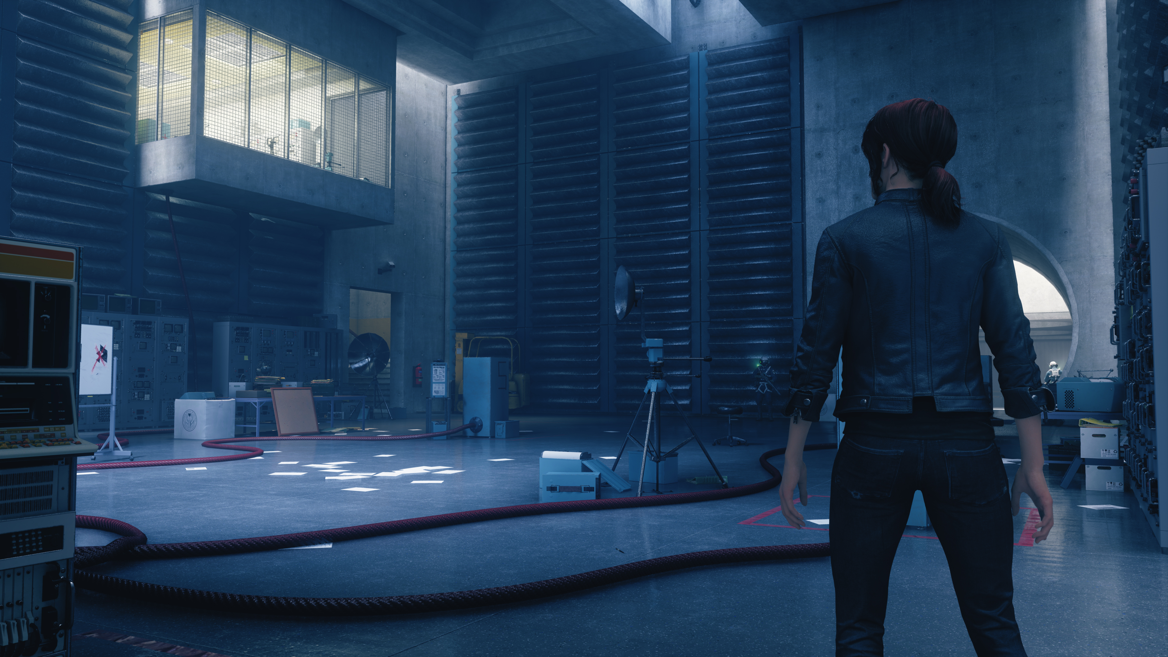 Returning to the question of High and Medium quality, we're switching scenes and placing our protagonist in front of a strongly illuminated scientific doodad, which is also showing her Screen Space Reflection.