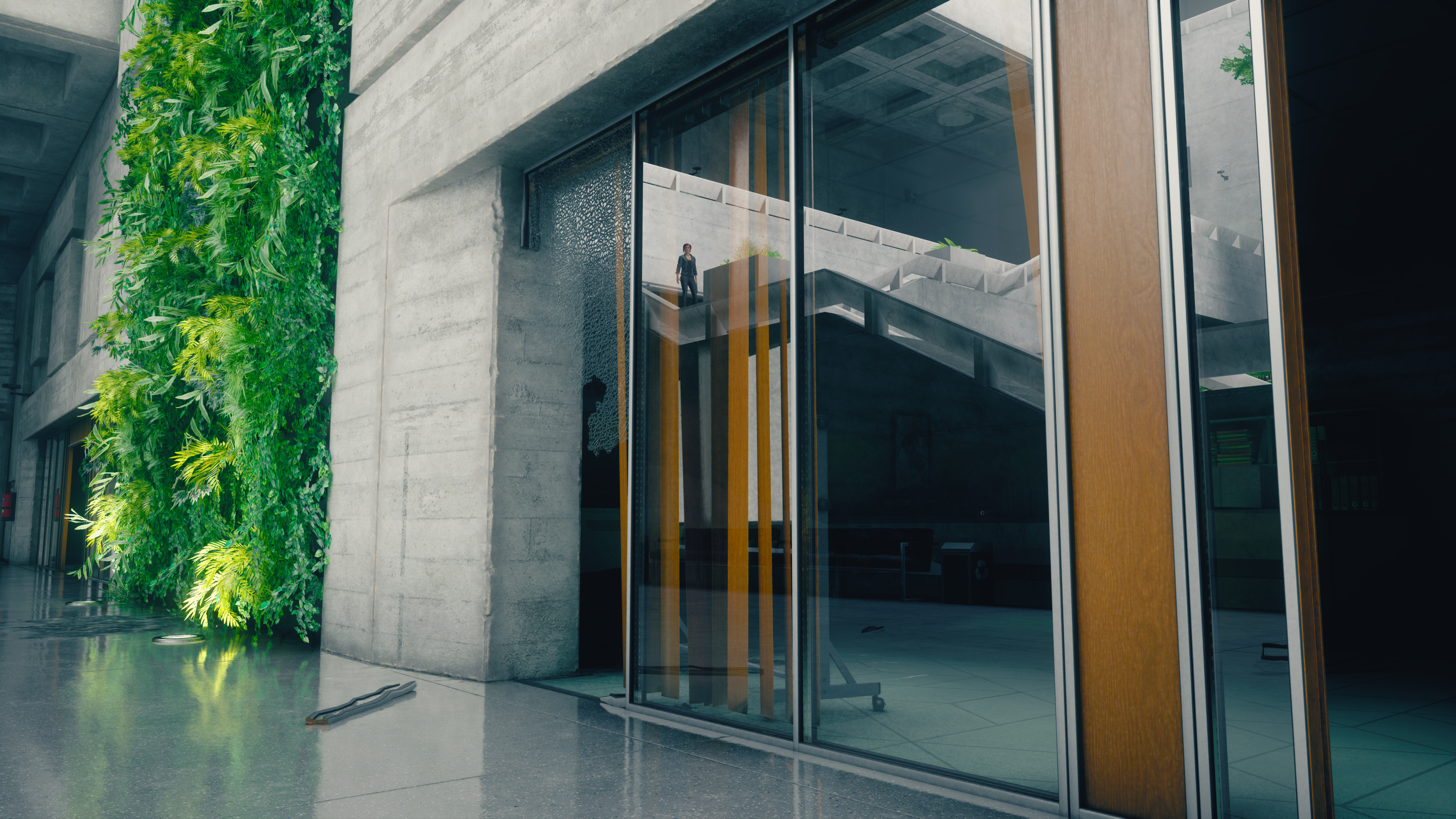 In the comparison below, we see Control’s generalized cubemap reflections replaced with real-time transparent reflections capable of showing characters, NPCs and other dynamic game elements moving across the scene. And as an added extra, we've enabled fractured glass to naturally display these transparent reflections.