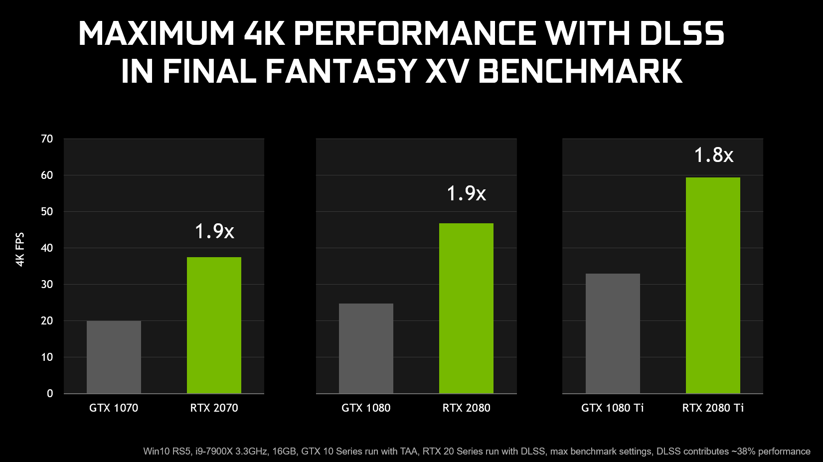 This performance boost, combined with the improved rasterization performance of GeForce RTX graphics cards, sees framerates increase by up to 2X at 4K, compared to 10-Series Pascal-architecture graphics cards. And with this extra