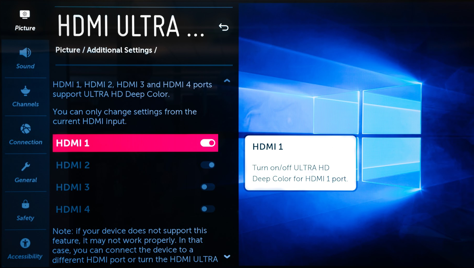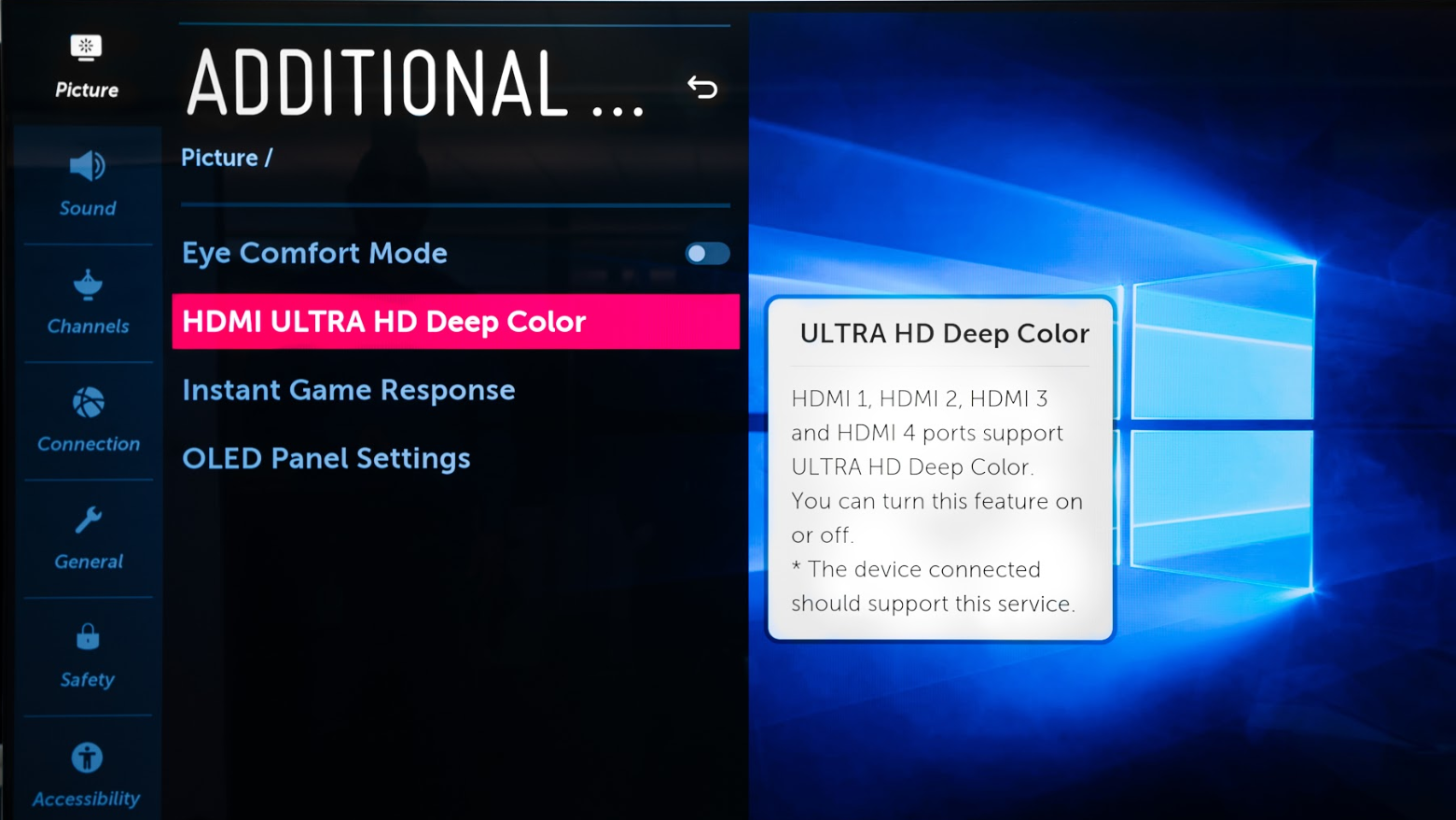 9. Enable Ultra HD Deep Color mode on your LG TV for improved color accuracy and vibrancy. Enter Settings → Picture Settings → Additional Settings → HDMI Ultra HD Deep Color → switch On for HDMI port connected to PC or laptop.
