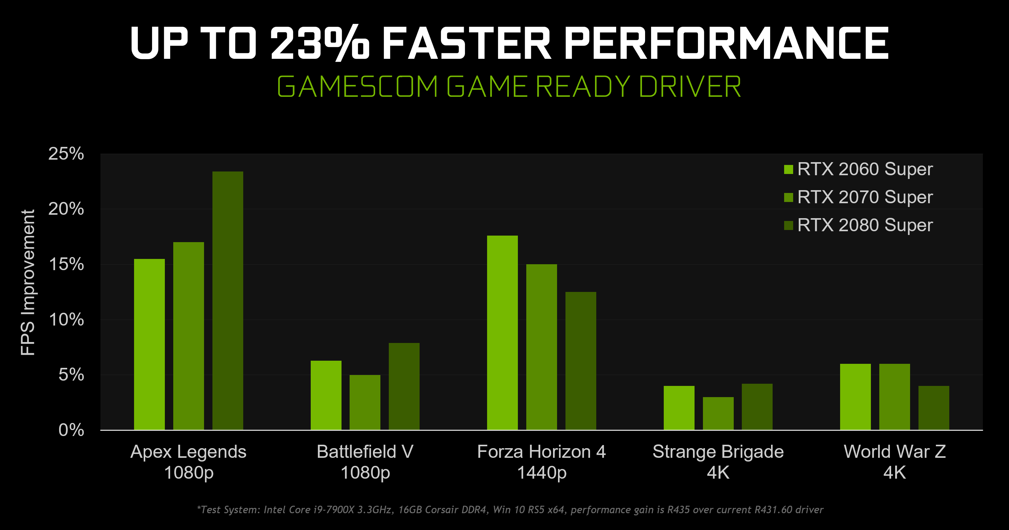 Our software engineers have been busy, crafting some sweet optimizations for Apex Legends, Battlefield V, Forza Horizon 4, Strange Brigade and World War Z that boost performance by up to 23%, compared to our previous driver, 431.60: