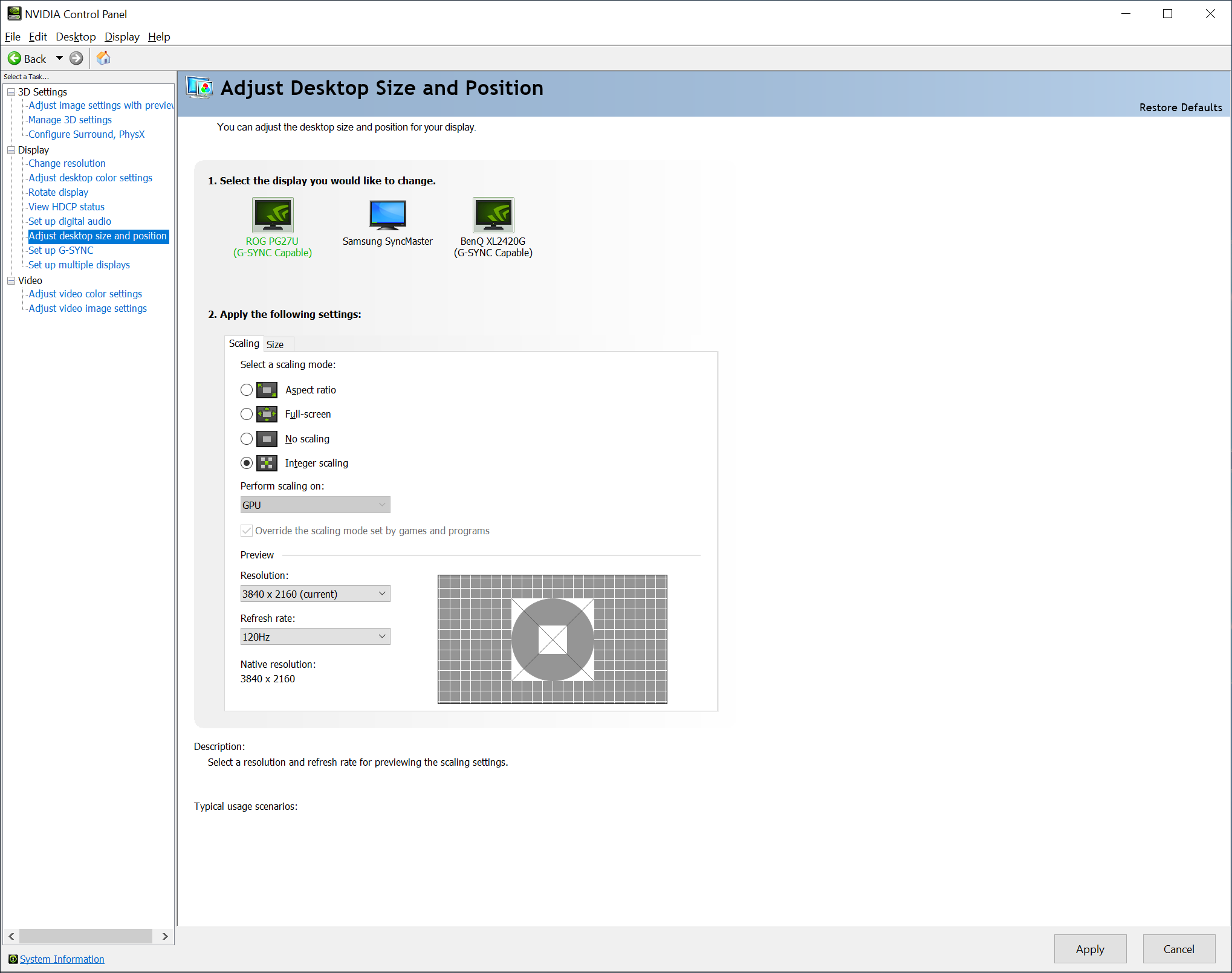So if you have a GeForce RTX or GeForce GTX 16-Series GPU, and have installed our new Game Ready Driver, you can enable an Integer Scaling beta in the NVIDIA Control Panel, in the “Adjust Desktop Size and Position” Display menu: