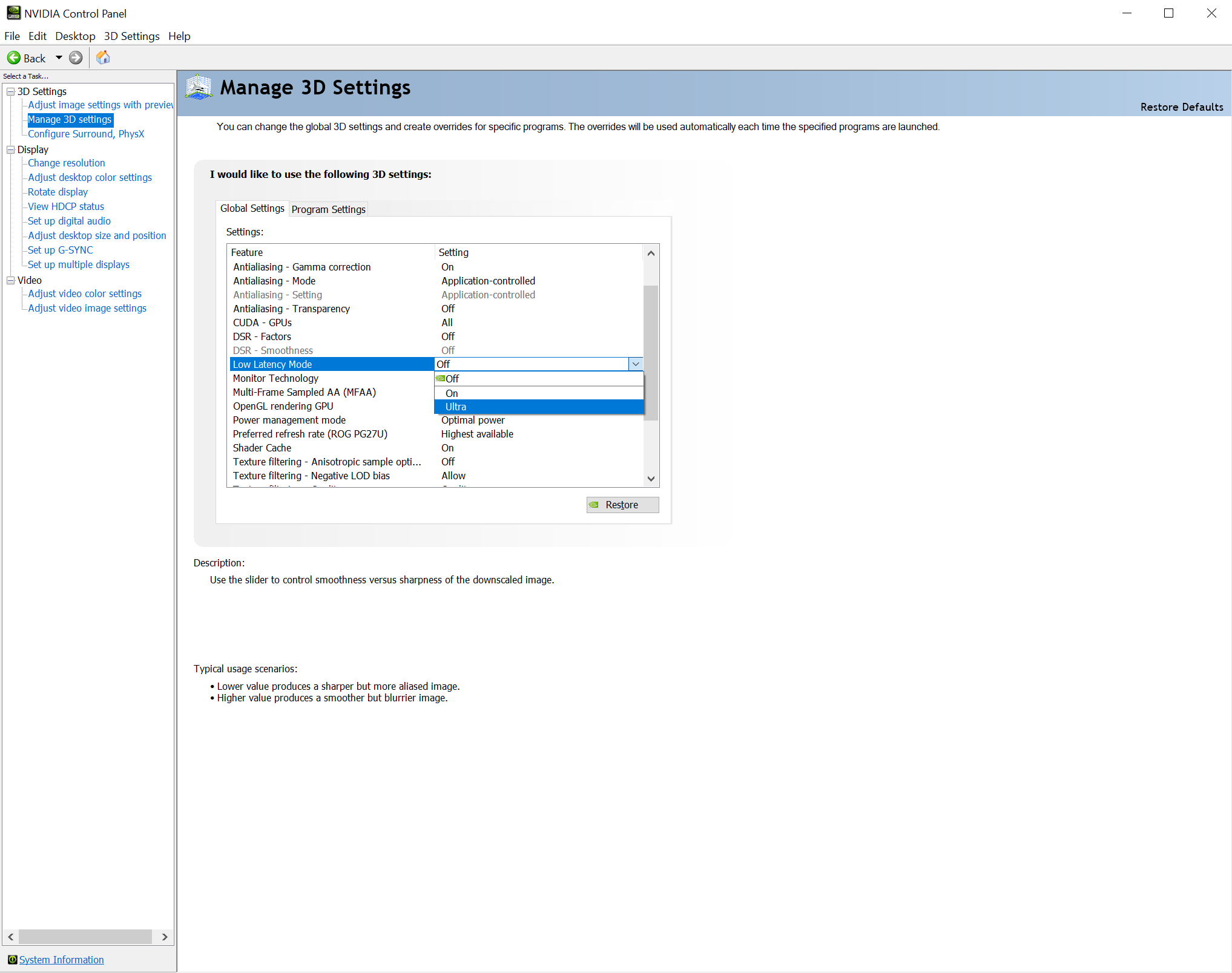To select a Low Latency mode, open the NVIDIA Control Panel, head to “Manage 3D Settings”, and scroll down to “Low Latency Mode”. Three options are available: