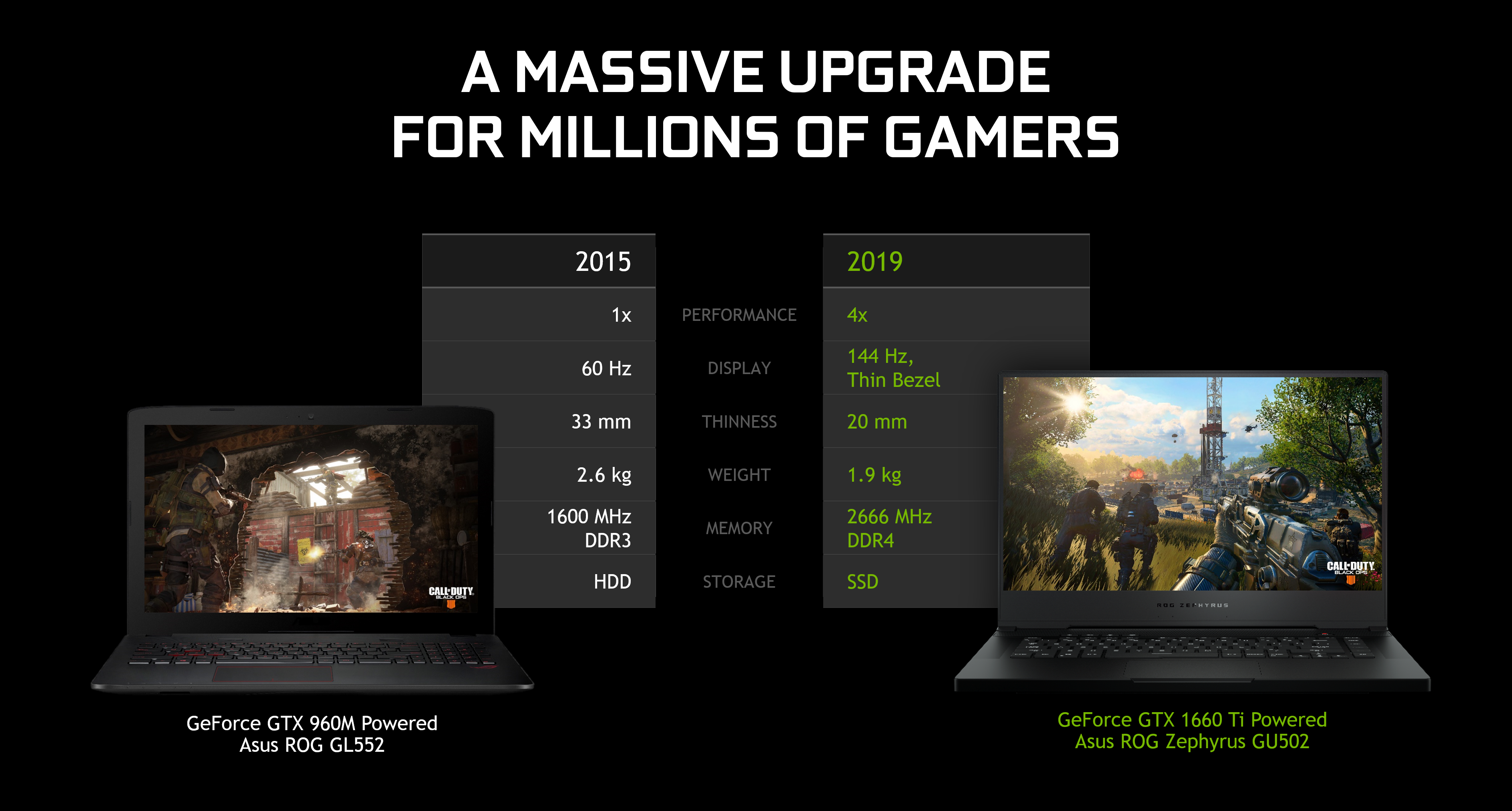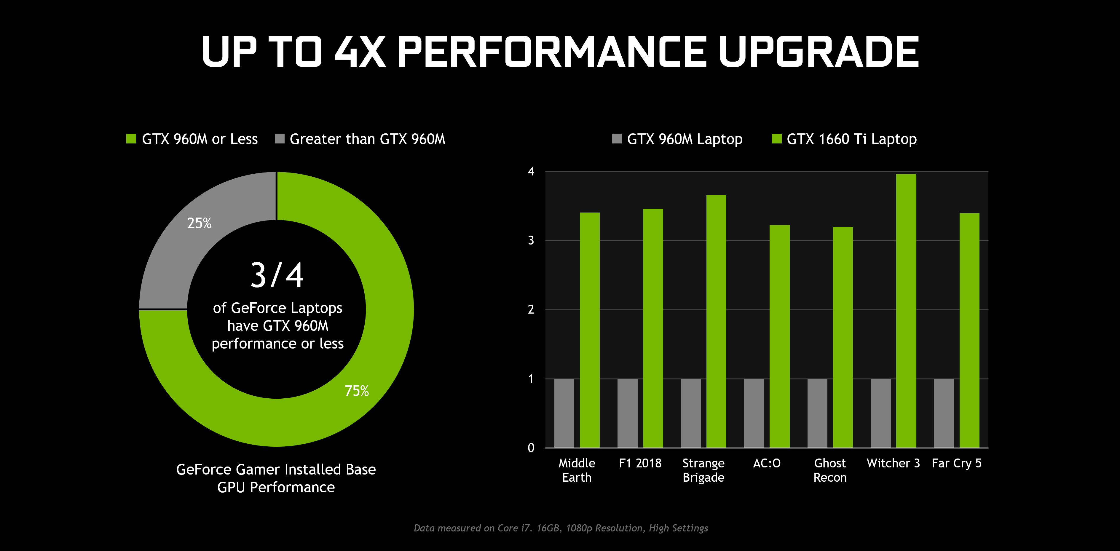 Laptop owners typically upgrade every four years - compared to 4-year old GTX 960M laptops, GTX 16-Series laptops are up to 4x faster in games