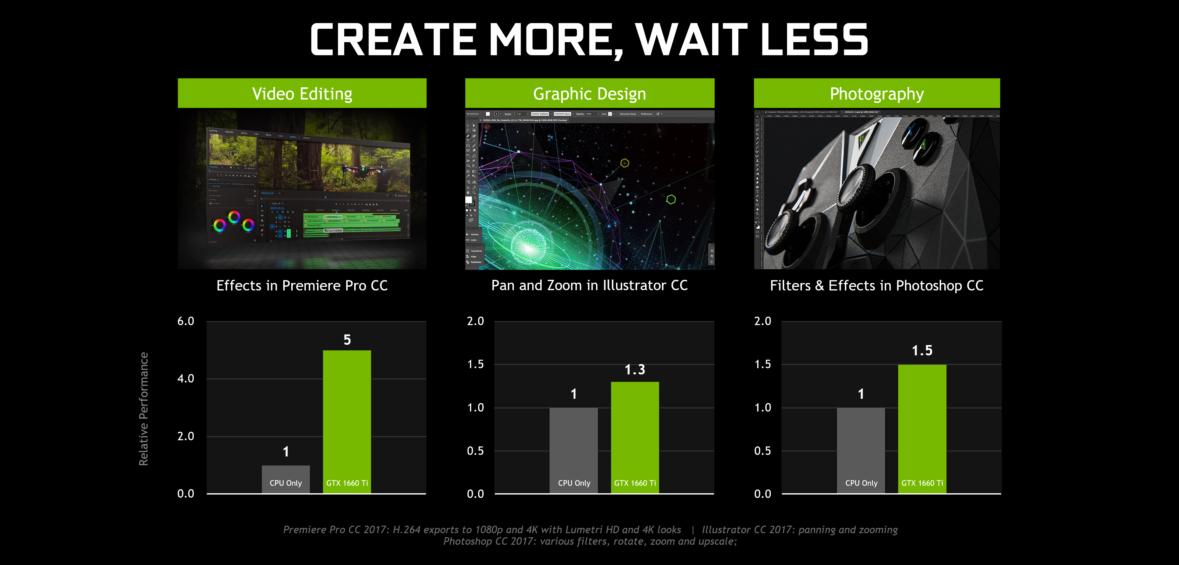 In addition to excellent gaming performance, GeForce GTX 16-Series laptops accelerate creative tasks up to 5x faster thanks to faster hardware and GeForce GPU graphics acceleration. Access advanced video effects in Adobe Premiere Pro CC, pan and zoom smoothly in Adobe Illustrator CC, regardless of display resolution, and create stunning art and photographs in both Adobe Photoshop CC and Lightroom CC with GPU-accelerated effects like Path and Spin Blur.