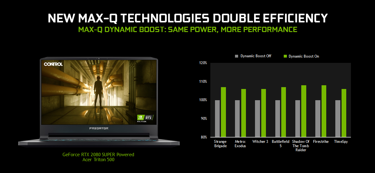 Max-Q laptops are highly engineered collaborations between NVIDIA and our OEM partners that let us develop and deploy groundbreaking new features that increase both performance and power optimization, such as Advanced Optimus and the new Max-Q Dynamic Boost, on supported models.