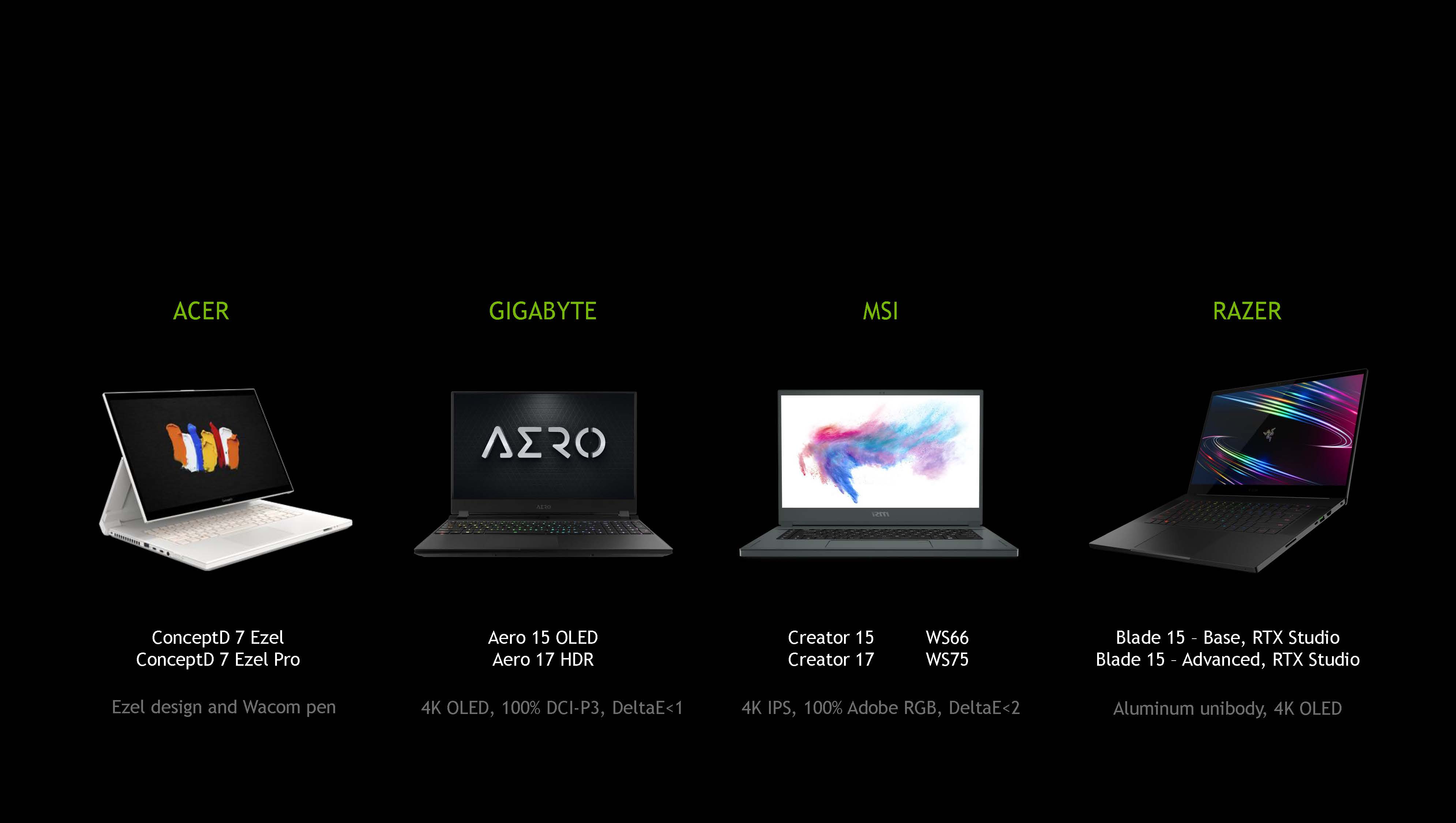 We’re excited to announce ten new RTX Studio laptops from Razer (Blade 15 Base and Advanced, RTX Studio Edition), MSI (Creator 15, Creator 17, WS66, and WS75), Acer (ConceptD 7 Ezel and Ezel Pro) and Gigabyte (AERO 15 OLED and AERO 17 HDR).