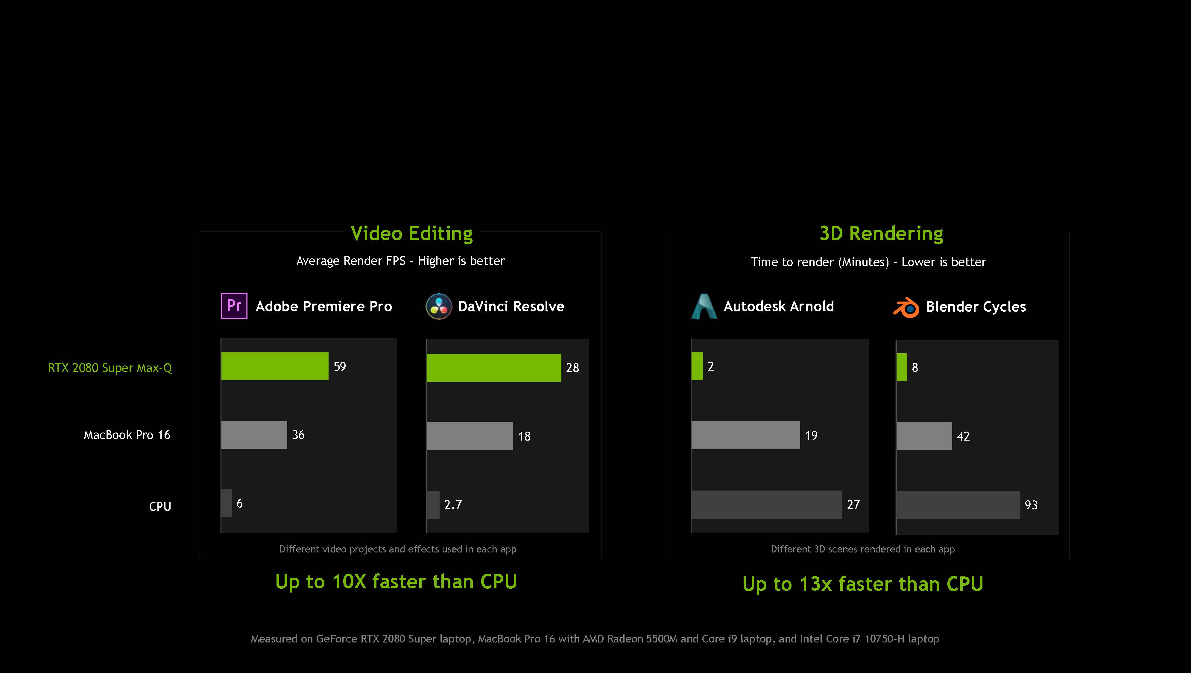 Performance comparison of the new GeForce RTX 2080 SUPER Max-Q laptop with a MacBook Pro 16 with AMD Radeon 5500M and Core i9 laptop, as well as Intel Core i7 10750-H laptop, in Video Editing and 3D Rendering