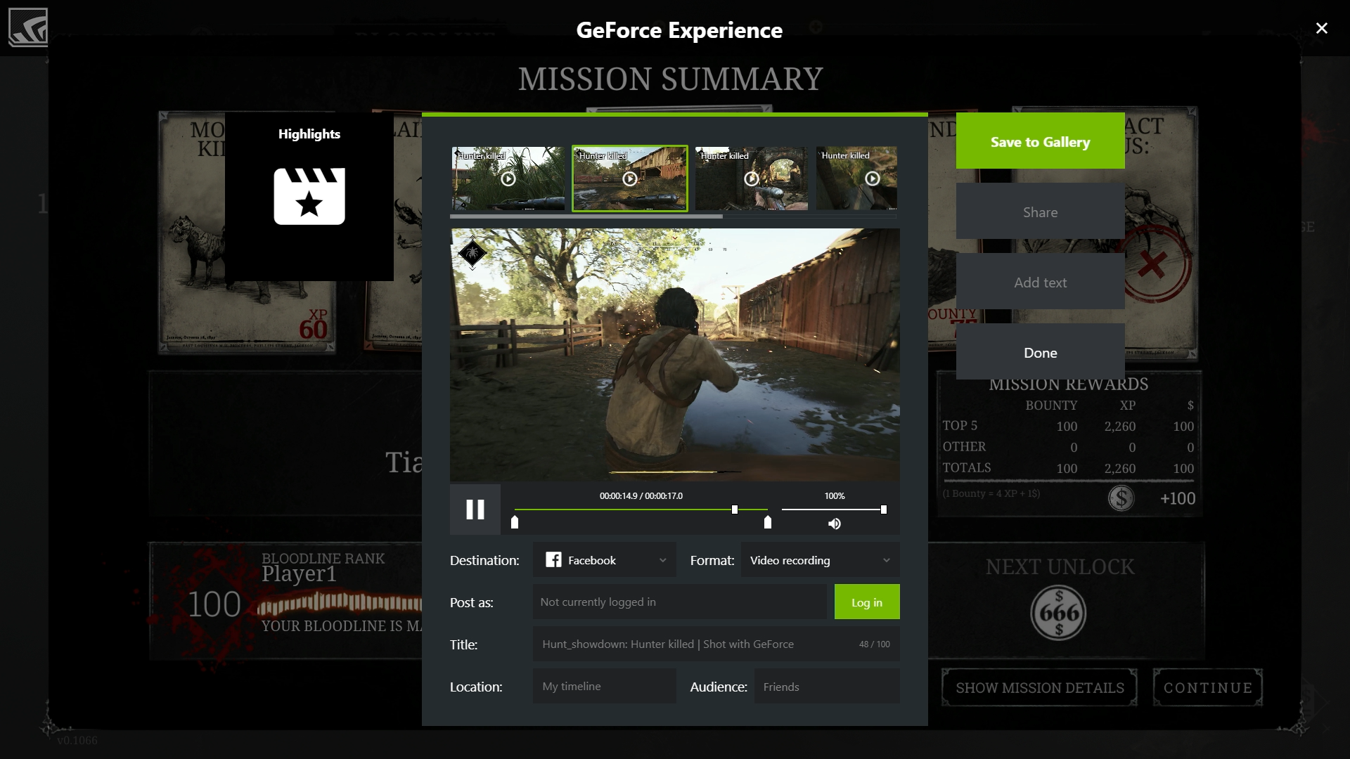 With both the update and driver installed, every death you suffer and every death of a human hunter you kill will be automatically recorded and saved. You can then choose which videos to keep, edit, add titles to, add on-screen text, and upload to social media, all within the GeForce Experience overlay.