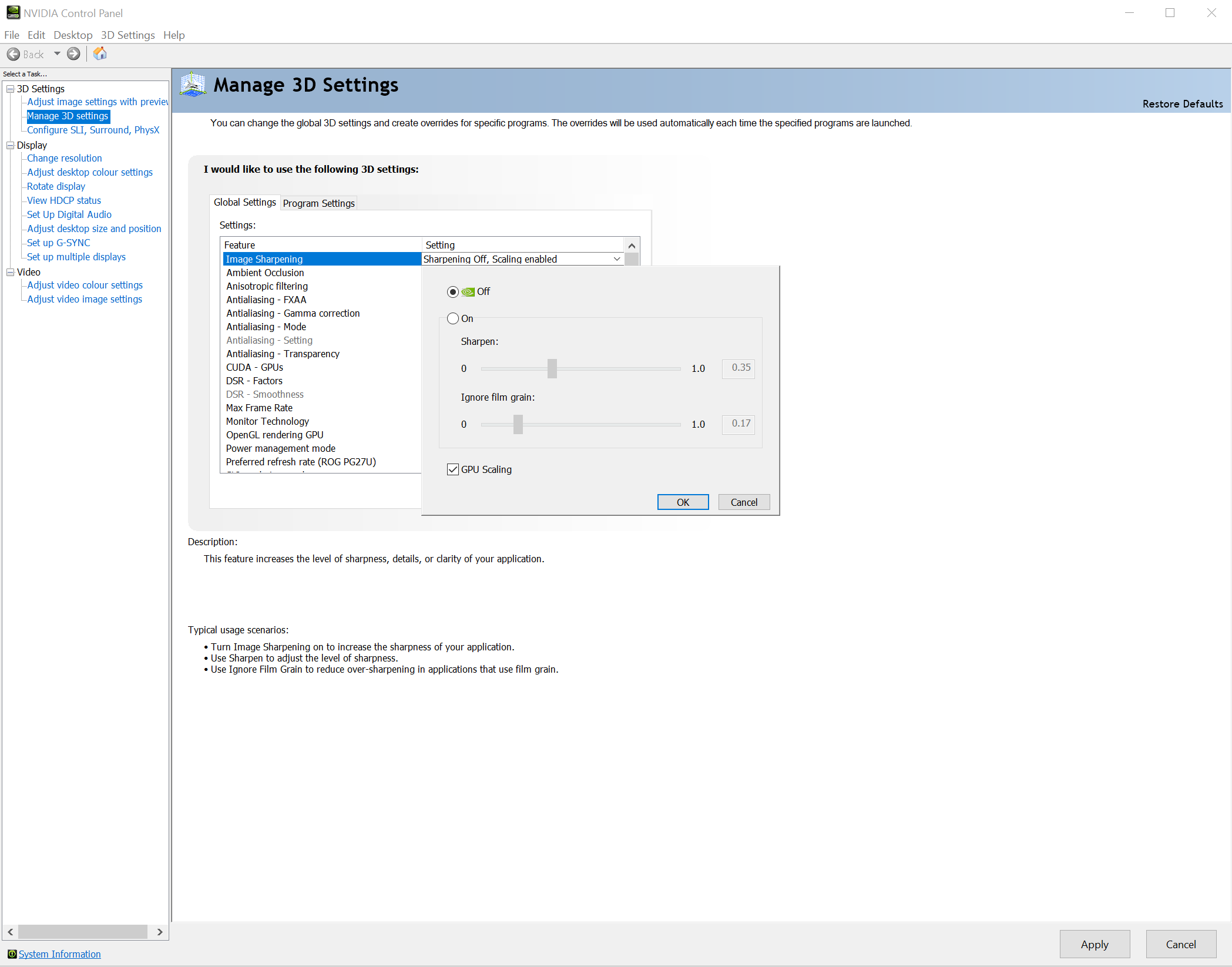To use image sharpening on your system, open the NVIDIA Control Panel and navigate to 3D Settings > Manage 3D Settings, select Image Sharpening, configure your options, hit OK, then click Apply on the bottom right of the Control Panel window.