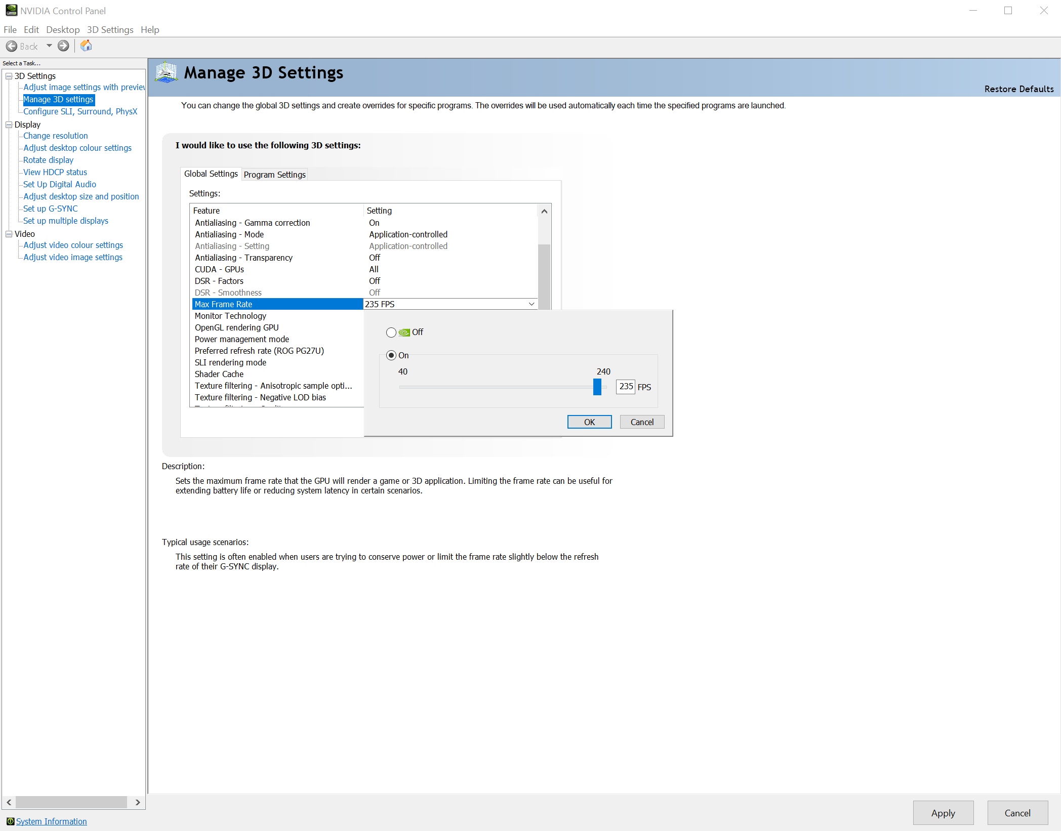 Now, you can set the max frame rate for a 3D application or game. This feature is particularly helpful when trying to save power, reduce system latency, or keep within a specific Variable Refresh Rate range on a G-SYNC or G-SYNC Compatible display.