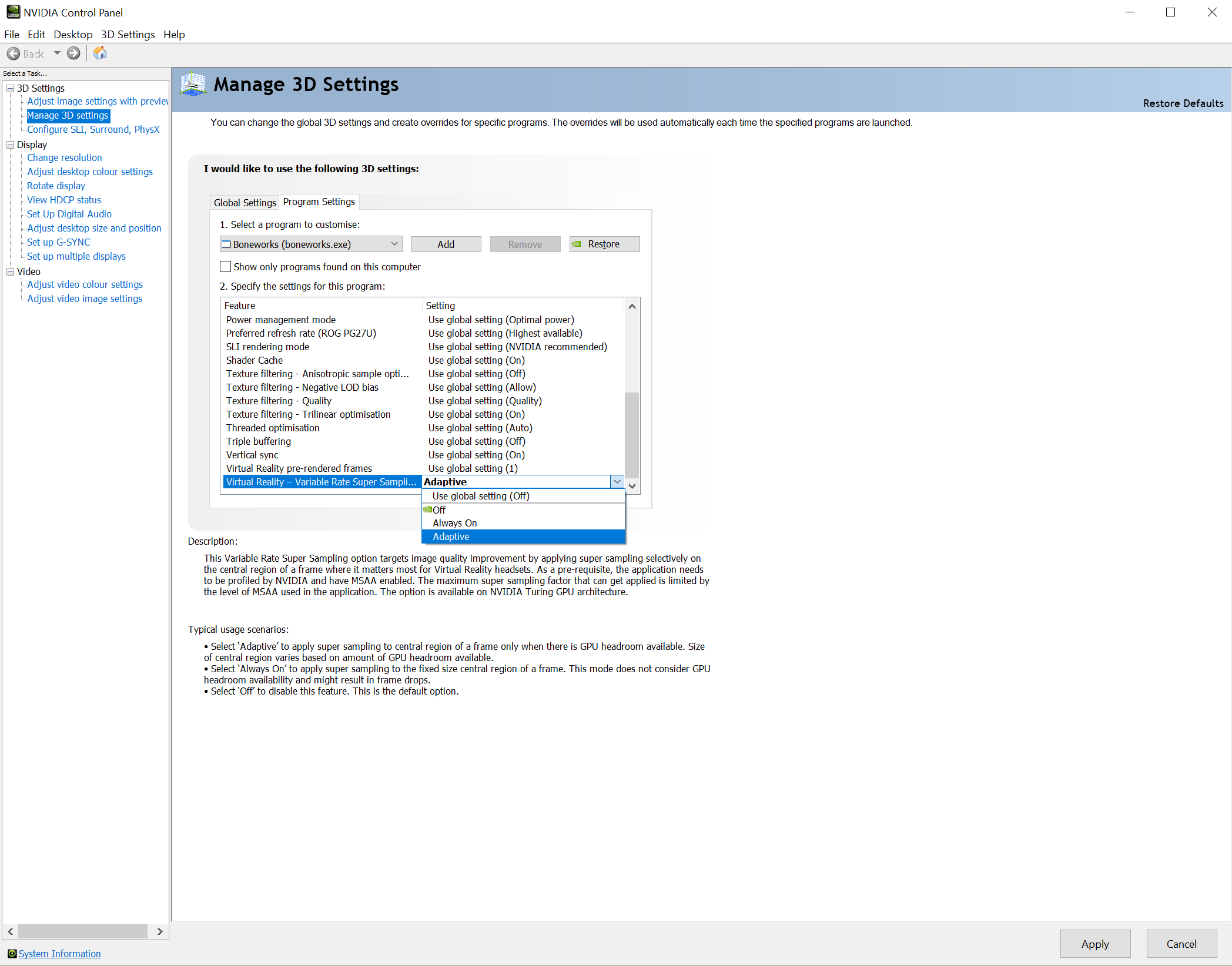 To enable VRSS, open the NVIDIA Control Panel and select Manage 3D Settings, then scroll to Virtual Reality – Variable Rate Supersampling, and change the setting to “Adaptive”.