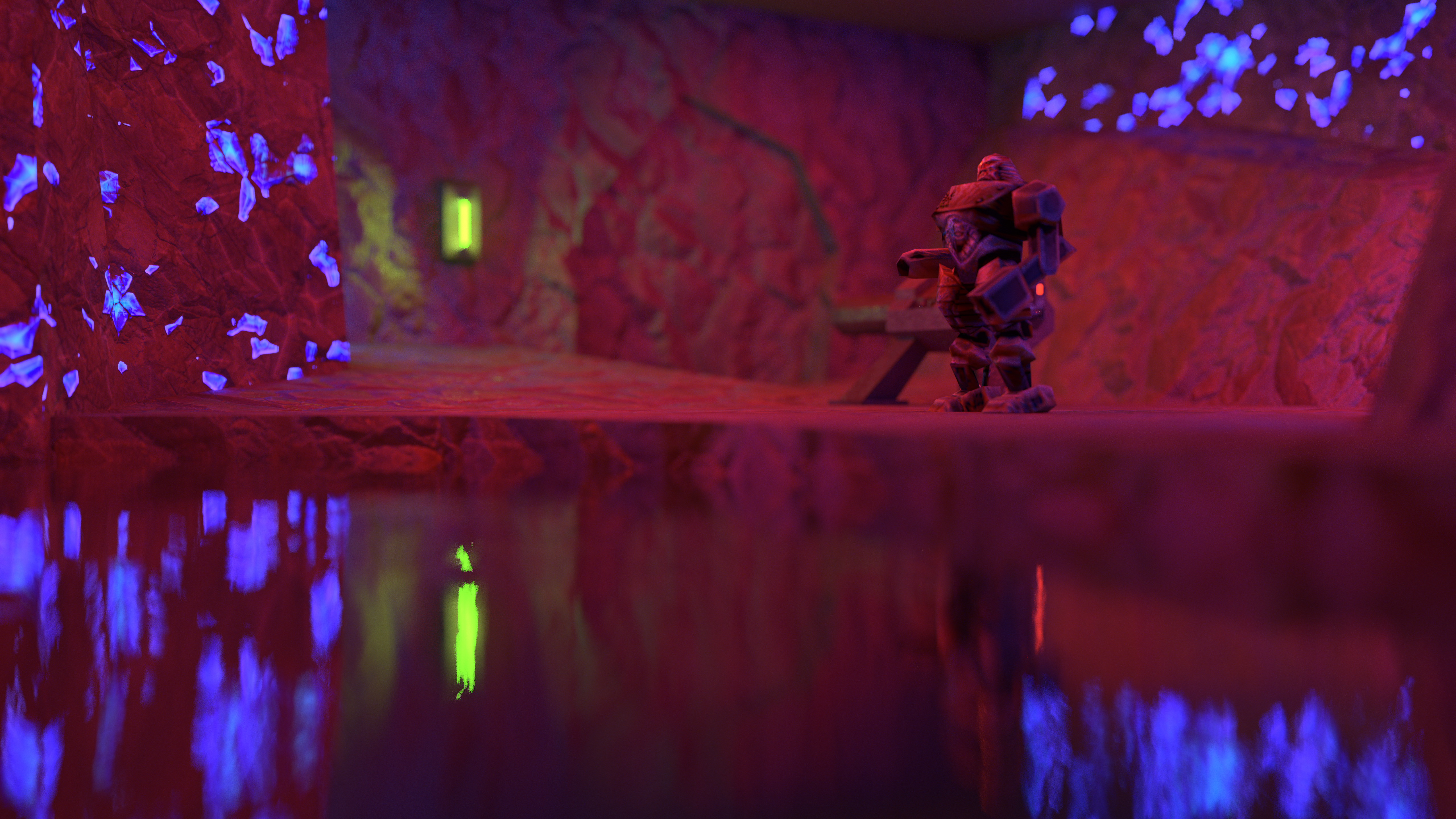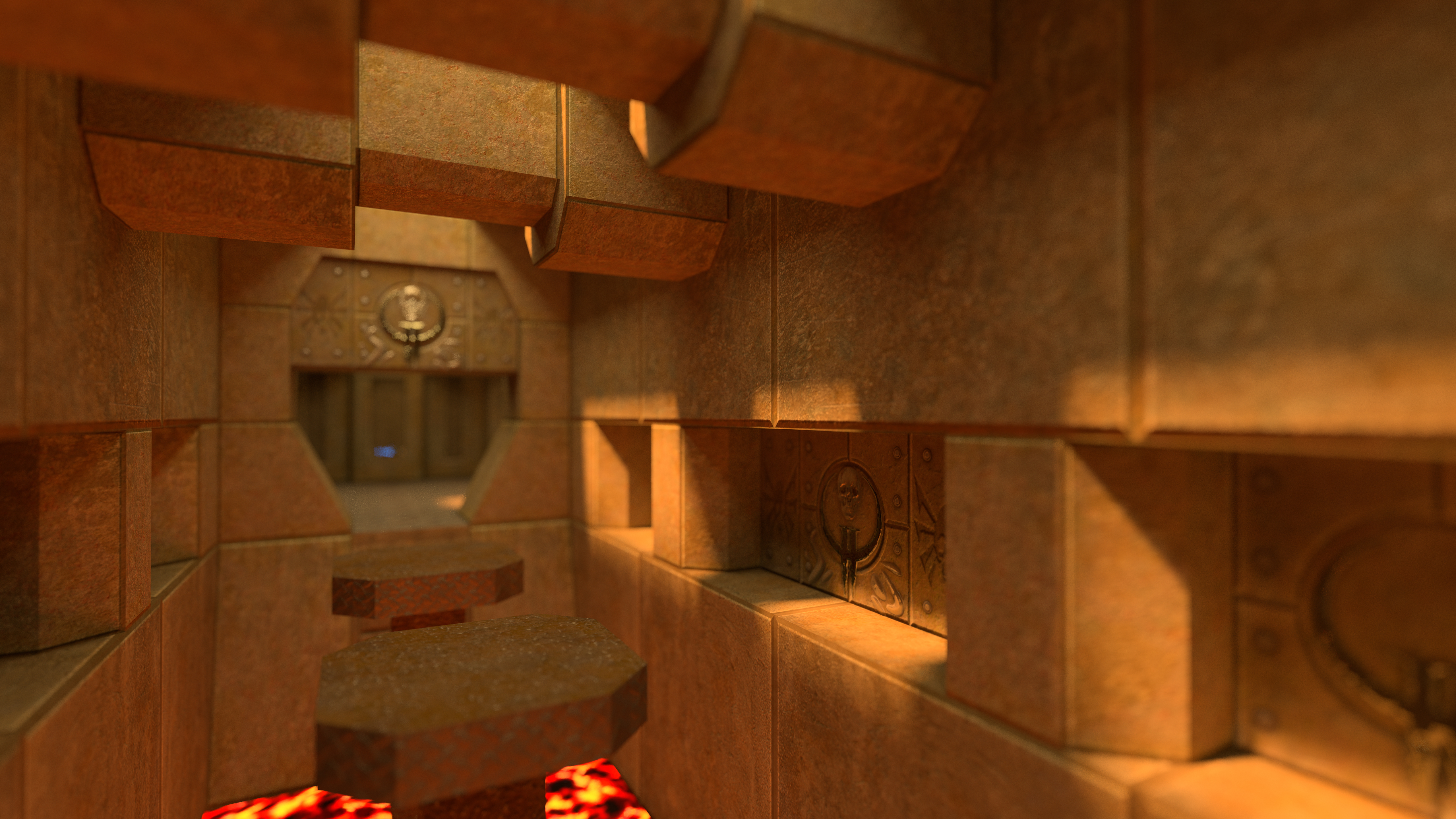 To add cinematic Depth of Field (DoF) effects to your photos, use the mouse wheel and Shift/Ctrl modifier keys: wheel alone adjusts the focal distance, Shift+Wheel adjusts the aperture size, and Ctrl/Ctrl+Wheel/Ctrl+Shift+Wheel makes the adjustments finer. In contrast with depth of field effects used in other real-time renderers, this implementation computes "true" depth of field, which works correctly through reflections and refractions, and has no edge artifacts. But to get those perfect results, accumulation rendering is required, which is why this effect remains exclusive to Quake II RTX’s new Photo Mode.