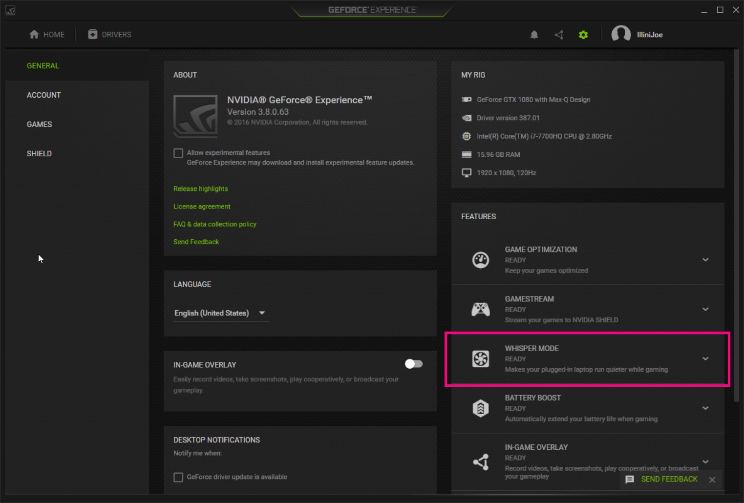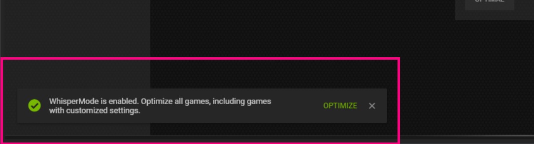 NVIDIA WhisperMode is an ultra-efficient mode designed to minimize the fan noisefrom laptops while still providing an excellent gaming experience. This is achieved through the intelligent pacing of frame rates and efficient selection of game settings. Combined, these methods reduce the amount of heat generated by the GPU which reduces the amount of heat that a laptop must dissipate. This means that the laptop fans can run at lower speeds and produce less noise – resulting in a more pleasant gaming experience for you, and anyone else in earshot.