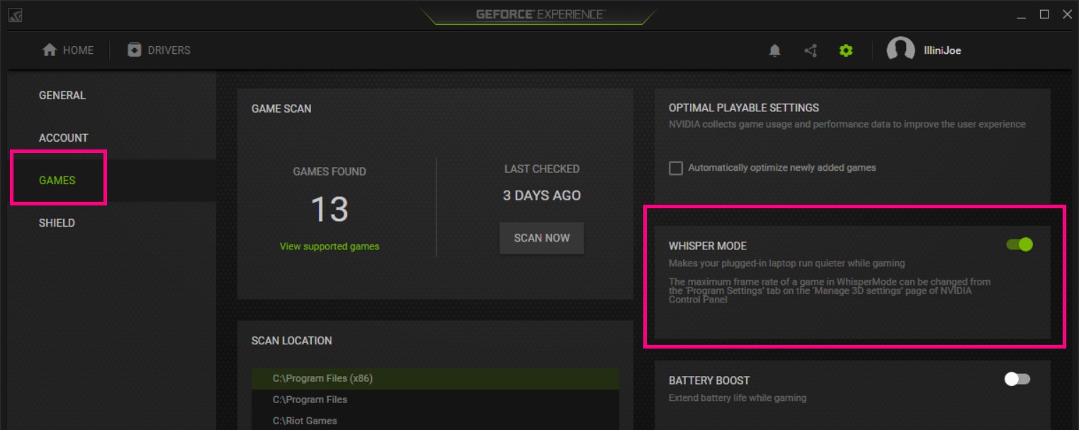 WhisperMode is enabled through GeForce Experience and intelligent frame pacing may be modified on a per-game basis in the NVIDIA Control Panel. WhisperMode comes preconfigured with intelligent frame pacing levels and efficient game settings specifications selected by NVIDIA, but as always, these specifications are fully user customizable.