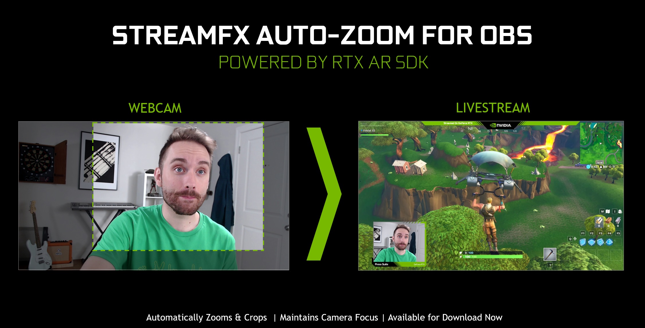 StreamFX, an OBS Studio plugin, released a new version that integrates NVIDIA’s RTX-accelerated AR SDK to enable a smart camera feature for game broadcasters that tracks your face and automatically crops and zooms to keep you at the center of the frame. It’s like having your own cameraman, powered by AI.