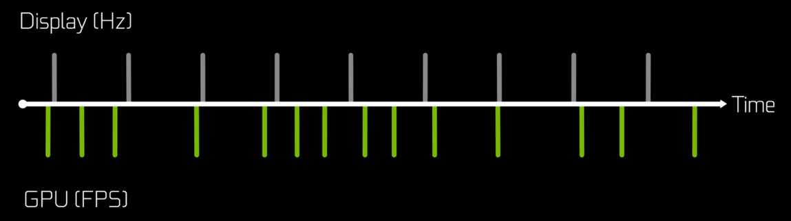 In the animation below you can see how the grey ticks on top represent frames being displayed by the monitor and the green ticks represent frames being completed by the GPU.