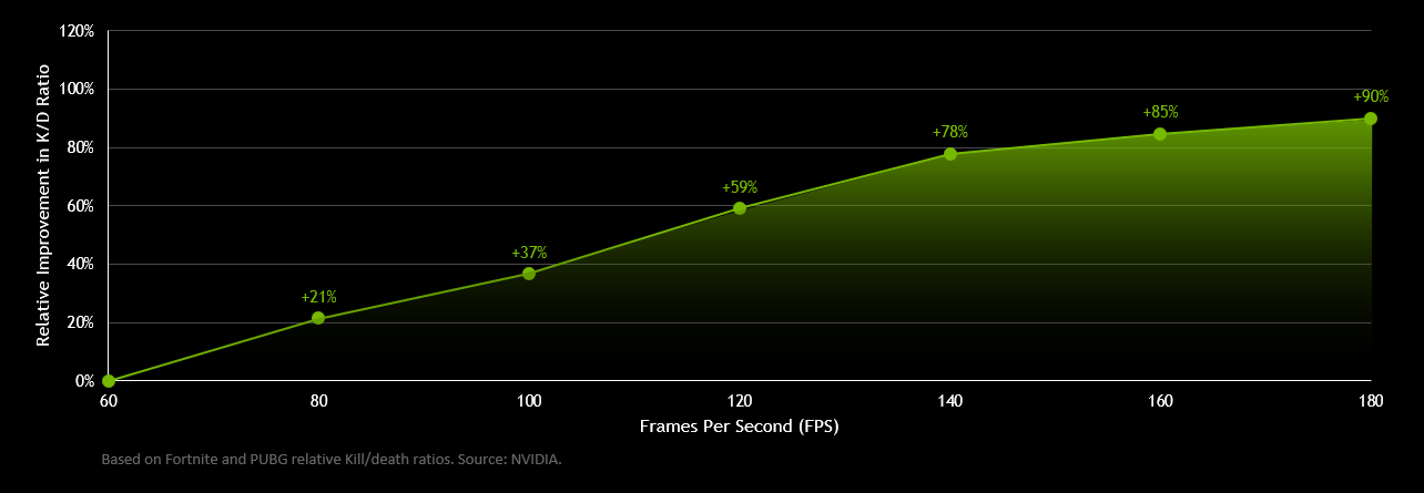 Inspecting the chart, we can see there is a correlation between gamer’s average FPS and K/D ratios in PUBG and Fortnite. At 180 FPS, player’s K/D ratios are 90% better than players at 60 FPS!