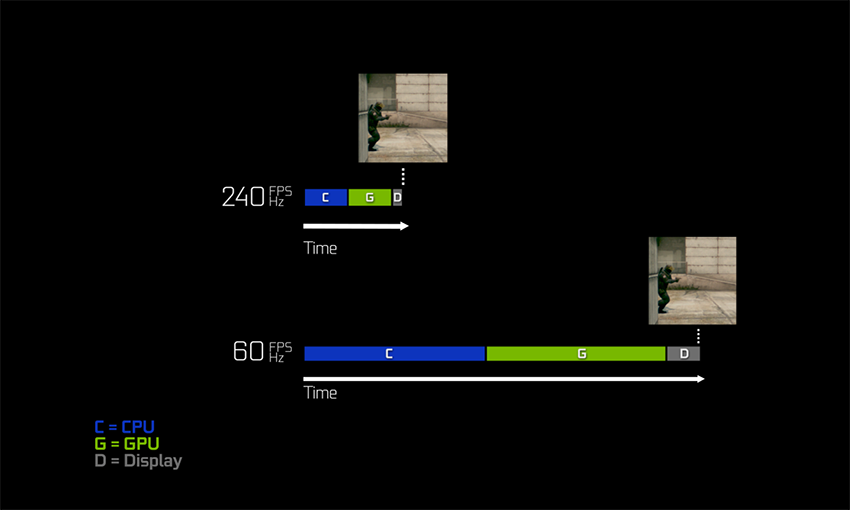 Starting at the beginning of time, each system’s CPU receives the player’s position at the same time. In this example, the CPU and the GPU take approximately the same time to prepare and render the frame. The CPU portion of the pipeline on the 60 FPS system is 4 times longer than the 240 FPS system. Similarly, the GPU render time is also four times longer on the 60 FPS system. Finally, the display section is also 4 times longer on the 60 FPS system as the refresh cycle is 4 times slower than a 240 Hz display.
