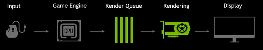 In the below example, we have simplified the pipeline down to three stages for easy explanation. Starting on the left, we have the CPU (denoted by the blue bar) that interprets input, updates the game state, prepares the frames for the GPU to be rendered, and places them in the GPU render queue. The GPU (denoted by the green bar), then takes those prepared frames from the queue and renders them. Once the GPU is finished, the Display (denoted by the grey bar) presents the final image on the next refresh cycle.