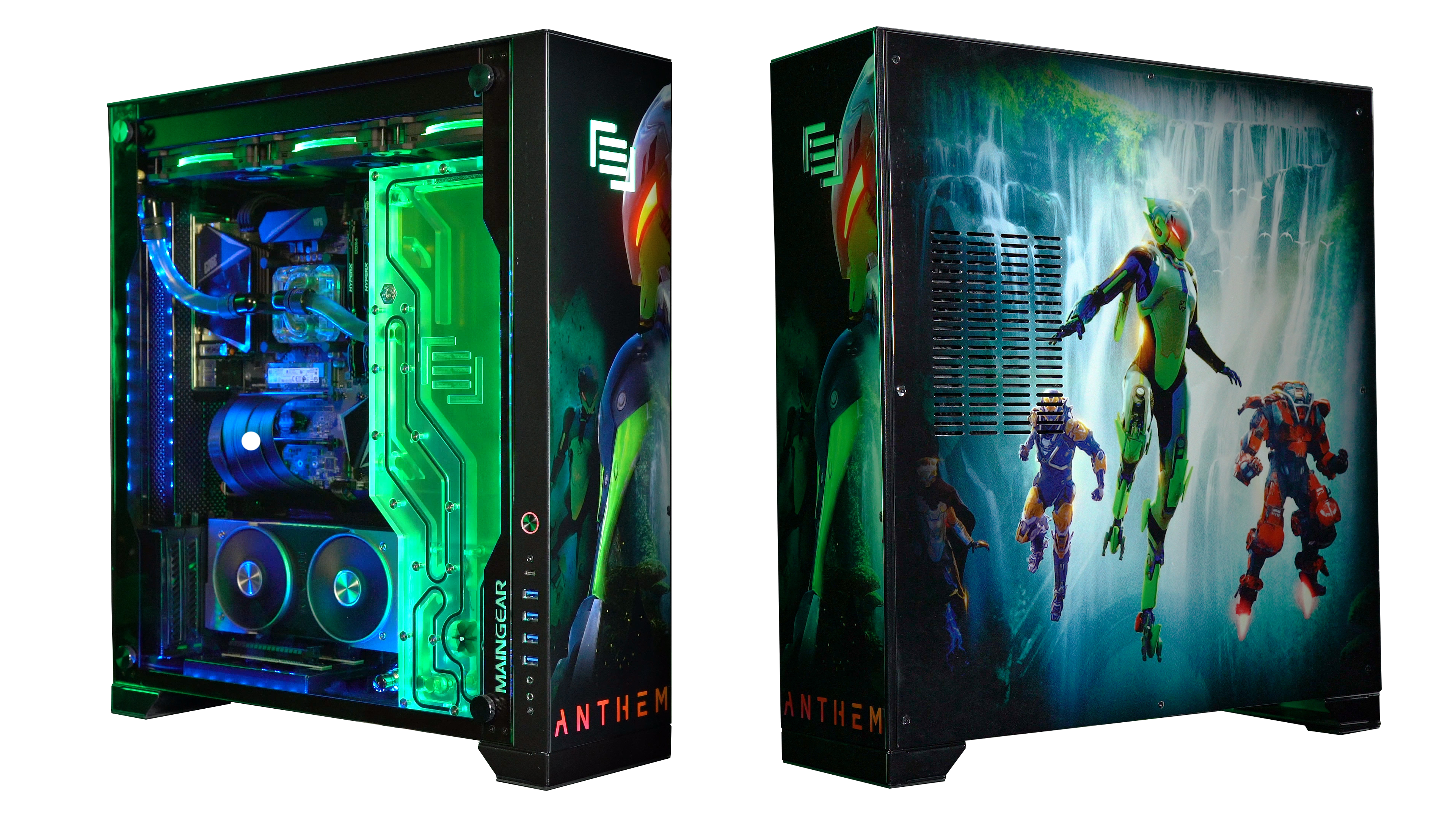 Maingear’s take on the Interceptor Javelin is built on their server-grade steel and precision-cut brushed aluminum F131 system and enshrouds it in Anthem-themed artwork. Using their exclusive 7-step process, Maingear has reproduced images from the game directly on the case with a durable high-gloss finish. You’ll find your favorite Interceptor front and center, with a shot of all four Javelins as they float in front of a gigantic waterfall on the right side. The tempered glass panel on the left side gives you a clear view of the green-themed accents and custom liquid-cooling system that will leave your friends green with envy. Inside, you’ll find the power of a GeForce RTX 2060, an Intel i5-9600K, and 16GB of DDR4.