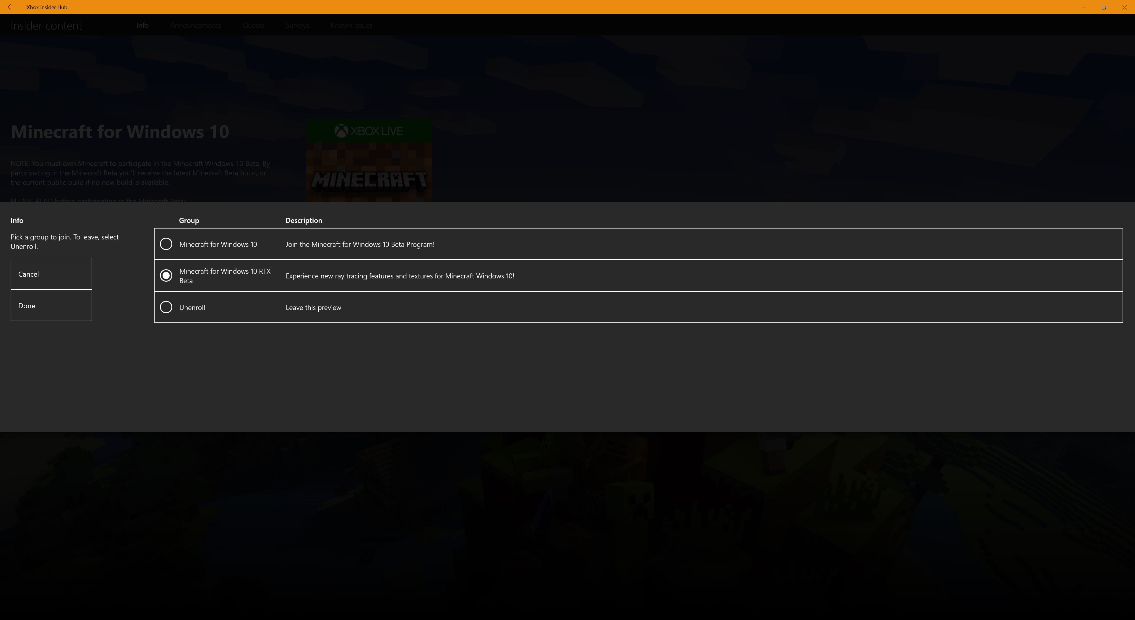8. Haz clic en "Administrar" y aparecerá una nueva ventana emergente que te dará la opción de elegir la versión beta de Minecraft en la que quieres participar. Si "Minecraft para Windows 10 RTX Beta" no está ya seleccionado, haz clic en él y luego en "Hecho". Y si alguna vez quieres dejar la versión beta y volver a la versión disponible públicamente de Minecraft para Windows 10, haz clic en "Anular inscripción" seguido de "Hecho"
