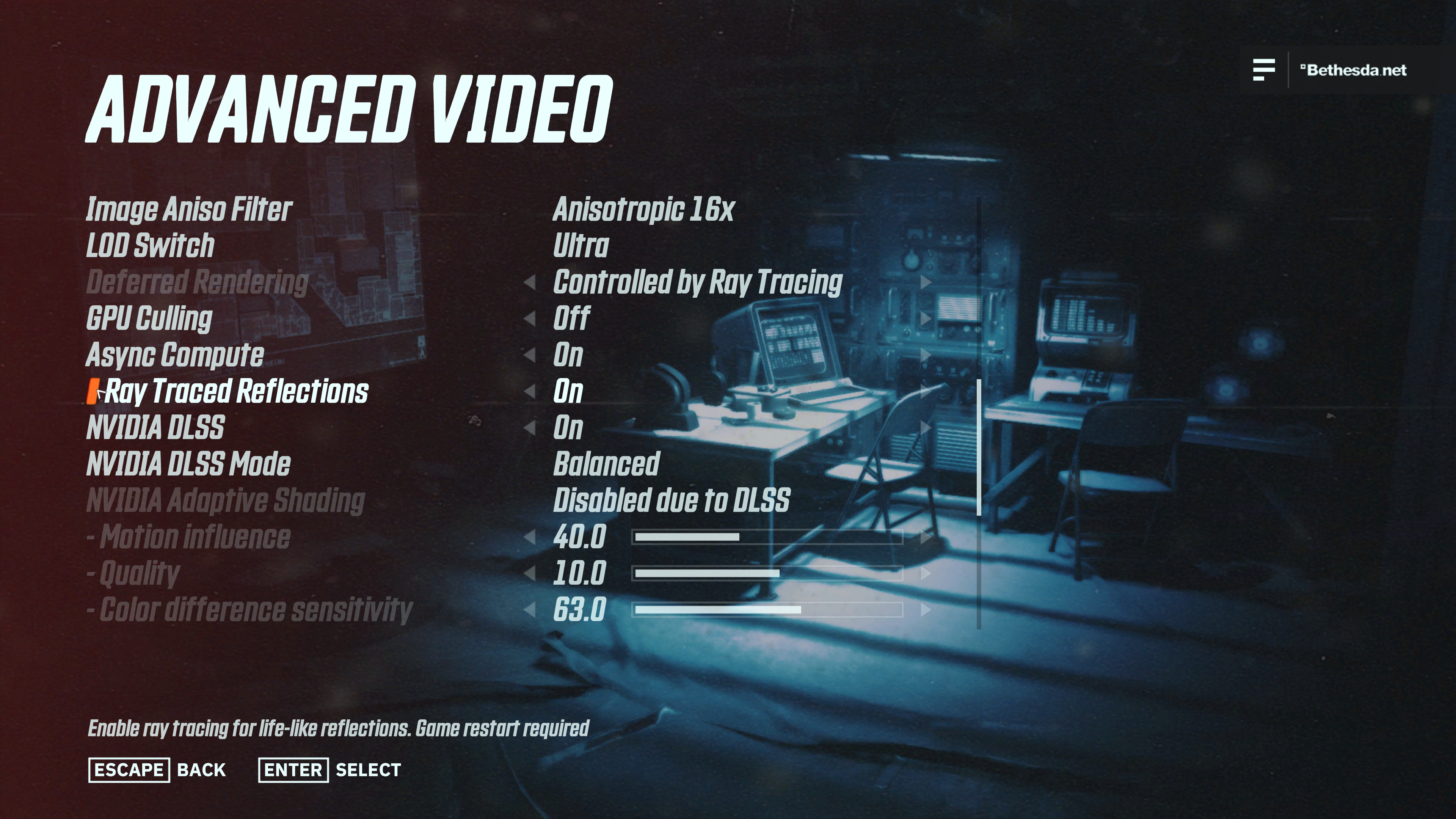 Para activar los reflejos con ray tracing, asegúrate de contar con el Driver Game Ready más reciente, la actualización de Windows 10 y el parche del juego instalado. Luego, navega hacia Opciones > Video > Configuración avanzada. Desplázate hacia abajo, activa Reflejos con ray tracing y reinicia el juego cuando se te solicite. En el mismo momento, podrás activar NVIDIA DLSS y seleccionar el modo DLSS, que ofrece a los jugadores diferentes balances entre rendimiento y calidad.